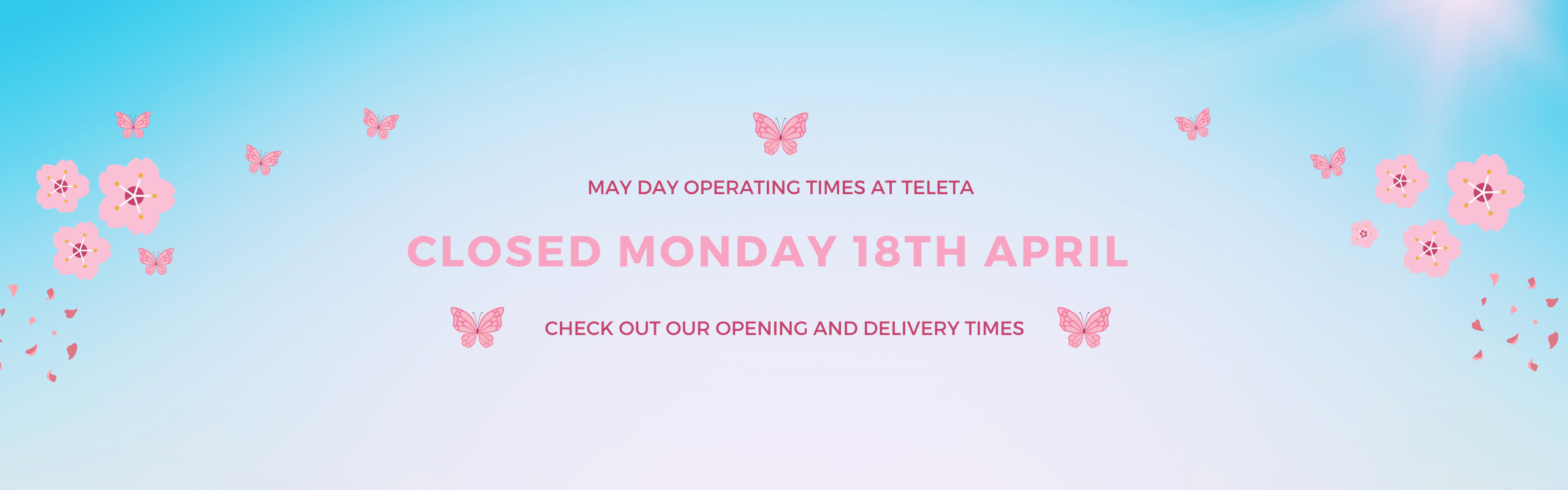 As we are closed on Monday May 2nd, for the May Day Bank Holiday, all orders placed after Thursday 28th 3.30pm cut off time through to Tuesday May 3rd, will be processed and dispatched on Tuesday May 3rd for delivery on Wednesday May 4th