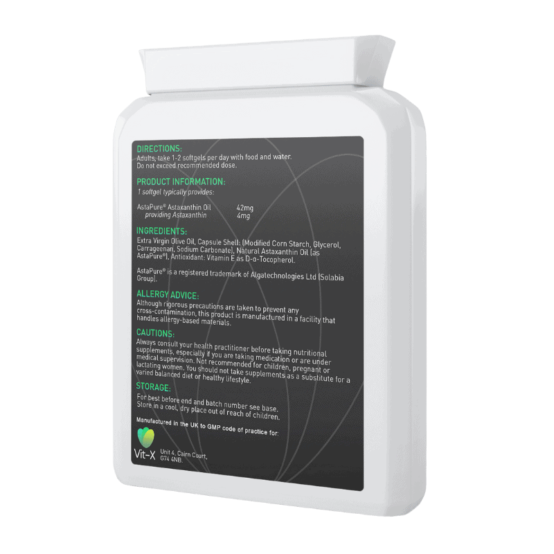 Our Astaxanthin 42mg AstaPure® Oil capsules contain 42mg of natural astaxanthin sourced from the microalgae Haematococcus pluvialis.