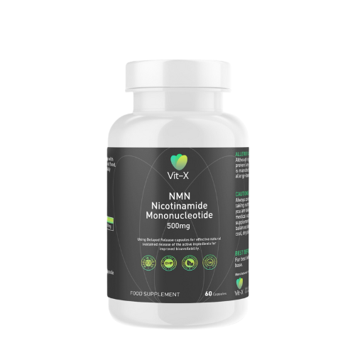 Vit-X NMN (Nicotinamide Mononucleotide) provides 500mg of NMN in a delayed release capsule to ensure maximum bioavailability.
